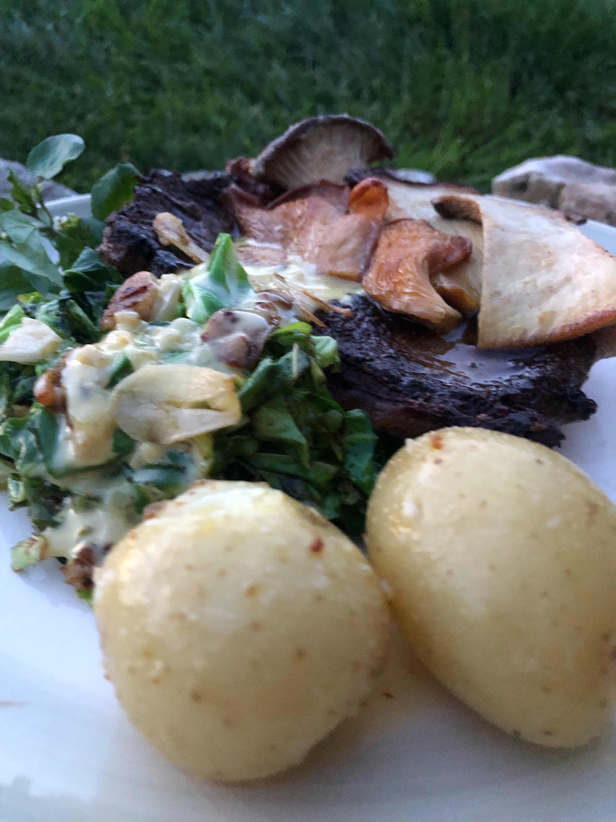 A real easy super flavoursome twist on pit beef, individual pit steaks charred and cooked juicy rare served with gorgeous garlic nutty butter mushrooms and new potatoes, for us these were fresh out of the ground from our West Dorset holiday home, Oh my Gosh these are the best potatoes EVER!  Served with wild cep and pink oyster mushrooms in a apple cider vinegar mustard sauce and garlic butter spring greens this was a awesome feast.
